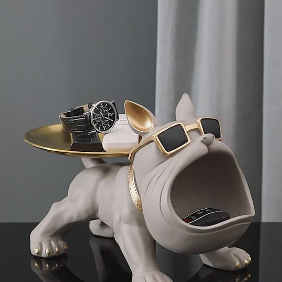 Crafted from high-quality resin, this Bulldog figurine features a stylish dog wearing sunglasses. Measuring 30cm x 17cm x 19.5cm (11.81" x 6.69" x 7.68"), it serves as a durable storage box with a spacious mouth perfect for holding phones, keys, glasses, remote controls, or sweets. Ideal for collectors and dog enthusiasts, it also makes an elegant gift for friends or children.