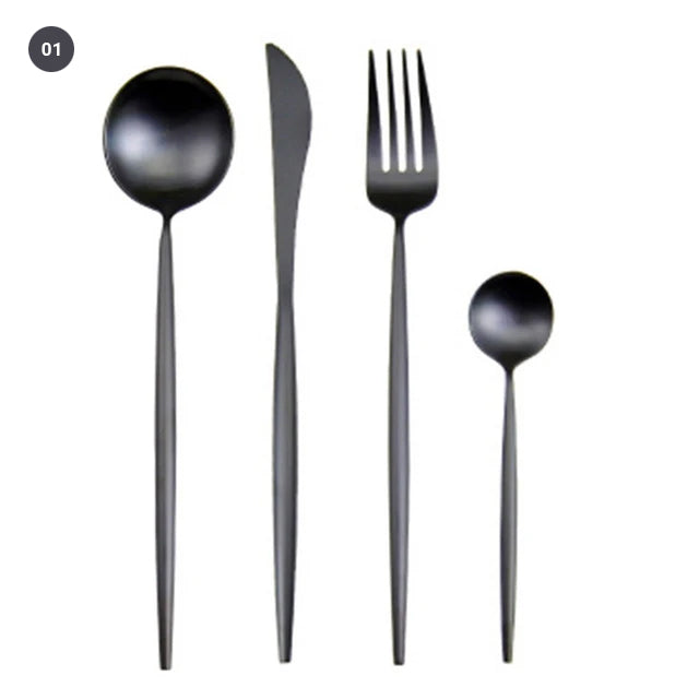 Package: Set of 4 pcs (1 x dinner knife, 1 x dinner fork, 1 x dinner spoon, 1 x tea spoon) or boxed set of 16 pcs (Each piece is individually wrapped in small protection bag).