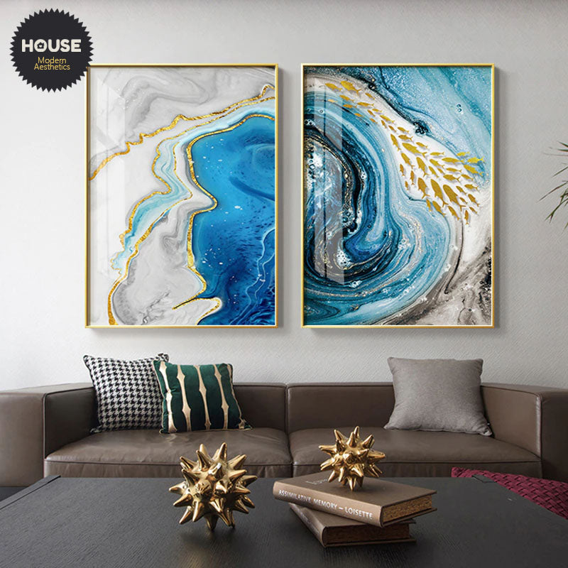 Subjects: Blue Sea, River, Golden Fish, Auspicious, Abstract, Luxury Art Decor