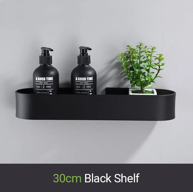 Matt Black Storage Shelf For Bathroom Or Kitchen Strong Modern Design Rigid Lightweight Space Aluminum With Optional Towel Rack No Drilling Required.