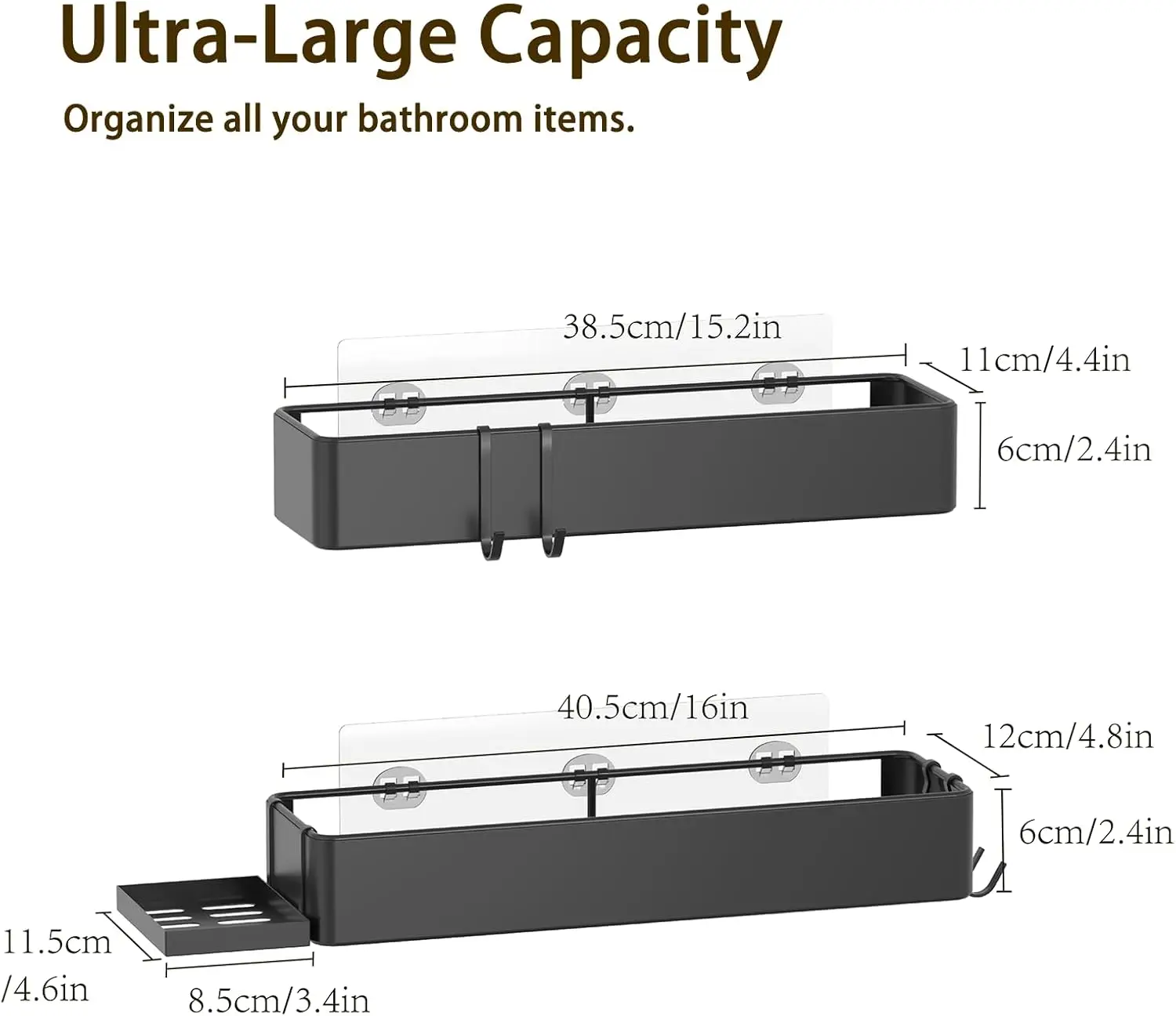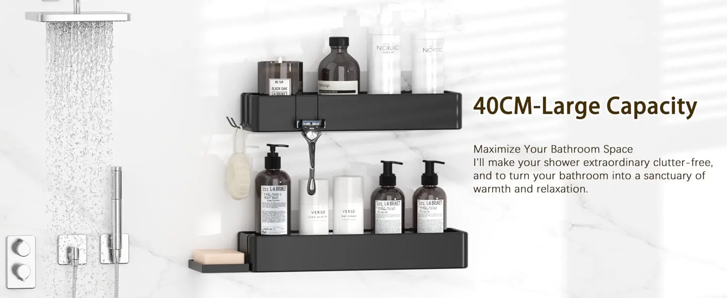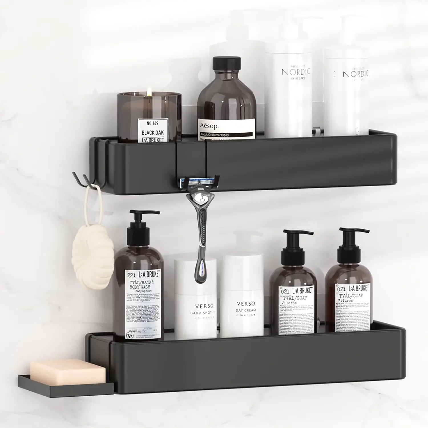 Transform your bathroom with this sleek adhesive shelf set—designed for effortless organization without the need for drilling. The dual-tier layout offers generous space for your daily essentials, from shampoo and conditioner to body wash and exfoliating tools. A dedicated soap tray keeps your bar within reach, while four integrated hooks provide smart storage for razors, washcloths, or hanging accessories.