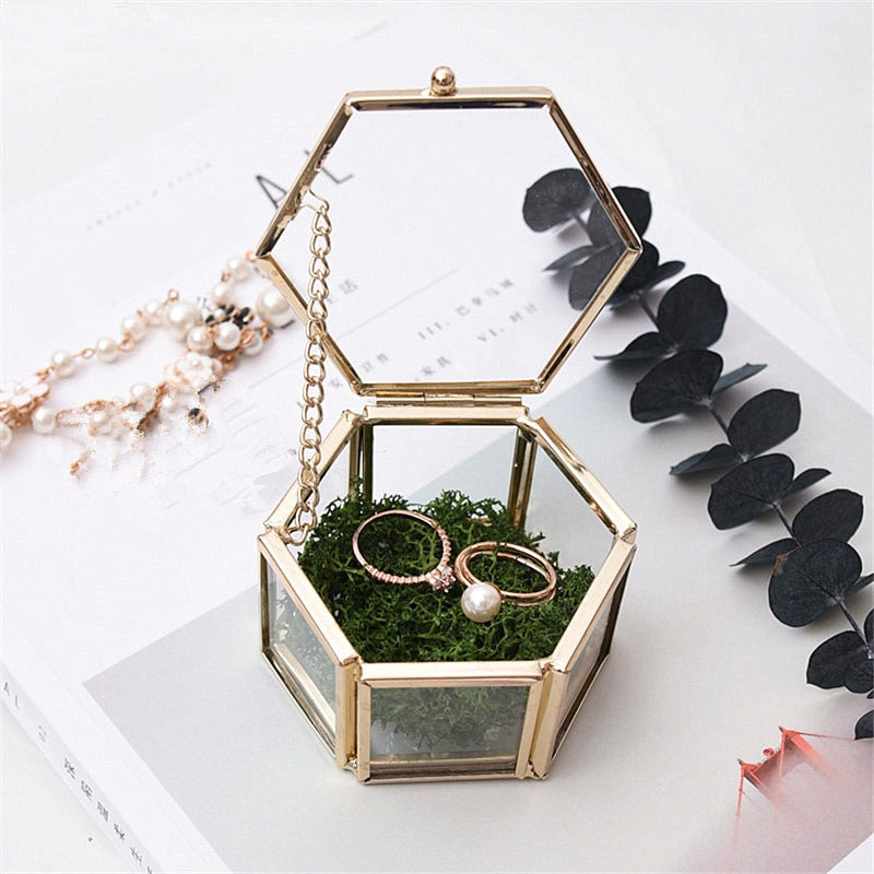 Geometric transparent glass Jewelry Box can use as jewelry organizer, tabletop succulent plants container, home jewelry storage and so on. Glass hexagonal terrarium box suit for displaying jewelry, pearl, mini plants, or small ornaments. Perfect for wedding parties and home decor.