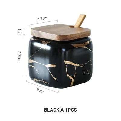 Condiments Container styles: Marble patterned ceramic with wooden lid.