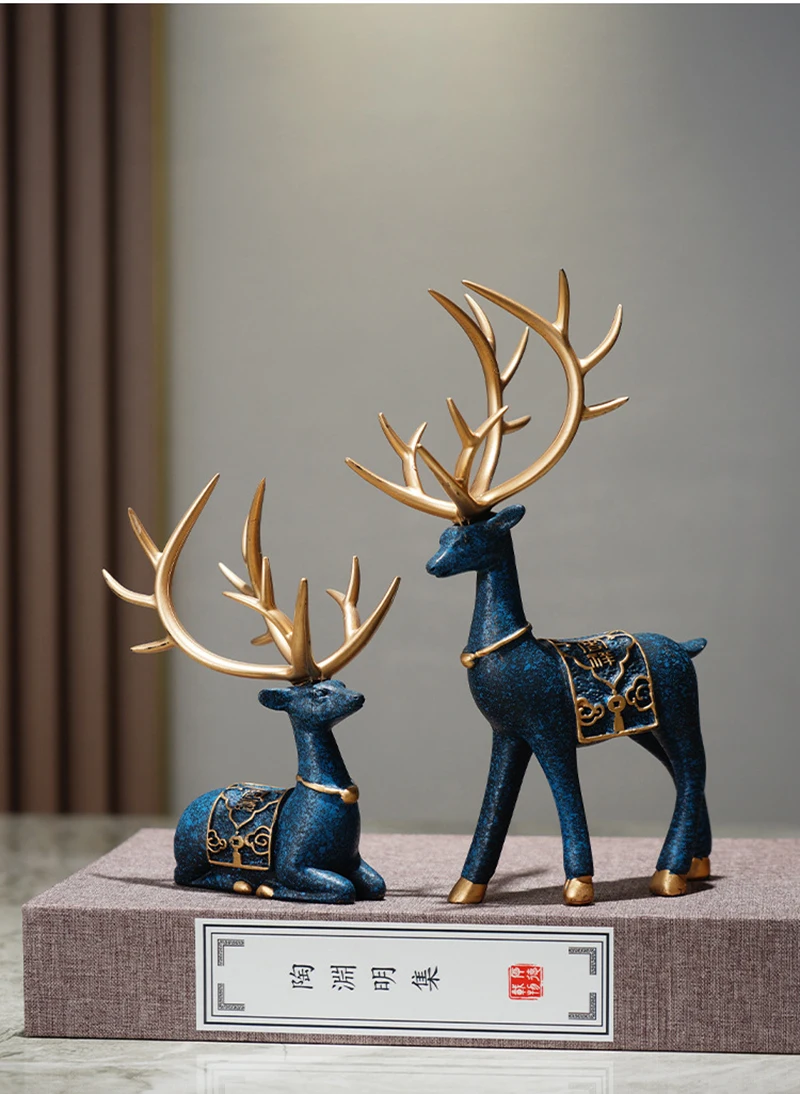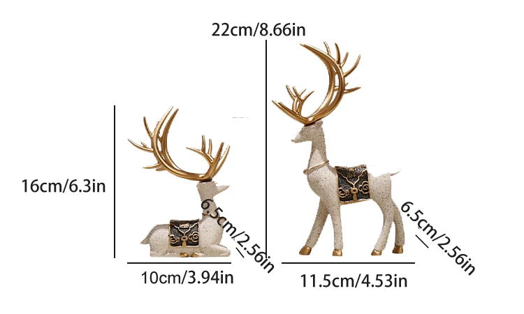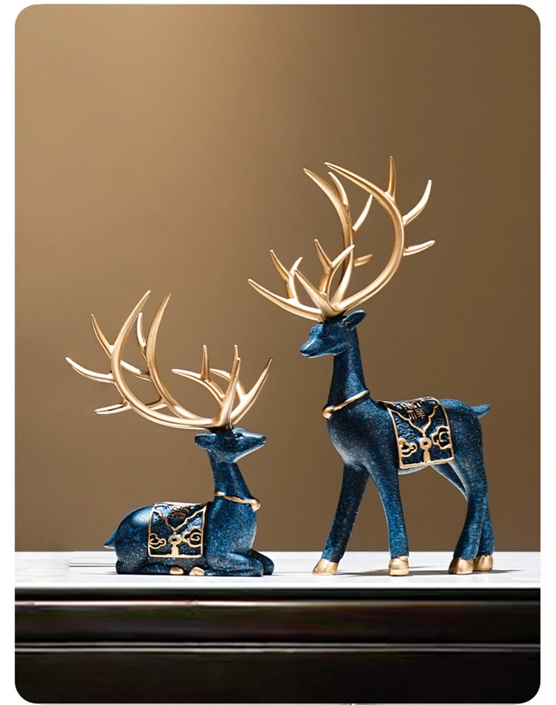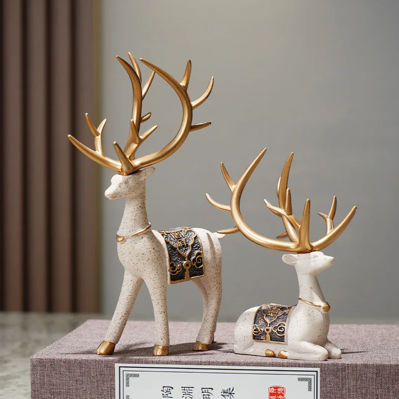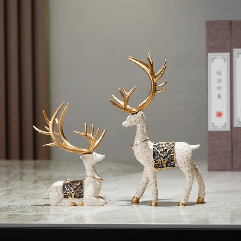 This set includes two golden resin deer figurines featuring elegant antlers, designed to bring a touch of auspicious charm to your living room, coffee table, desktop, or mantelpiece décor.