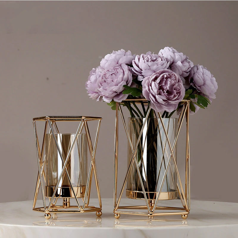 Stylish Geometric Metal And Glass Vase Nordic Style Living Room Decoration Rustic Brass Vases For Flower Arrangement Trending Latest Home Interior Decor.